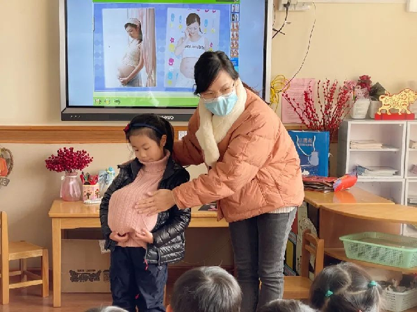 没有妈妈的辛勤哺育,就没有今天快乐成长的我们;没有外婆奶奶的用心呵护,就没有今天简单善良的我们。我们也来体验一天“孕妈妈”,感受妈妈怀孕时的辛苦,体会妈妈和奶奶们的不容易。瞧,在老师的帮助下,我们的肚子准备好了。变身“孕妇”!怀着宝宝还要做很多事情,很不容易,妈妈奶奶们真伟大!