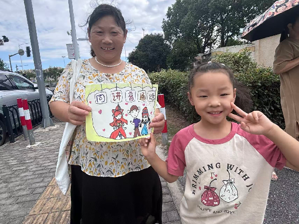 当绘本遇上普通话,当亲子陪伴撞上阅读时光,小班萌娃和爸爸妈妈开启了一场汉语言的浪漫邂逅。在温馨的共读时刻,幼儿在家长的引导下,用标准的普通话认读绘本里的每一个字符、每一段故事。那些充满童趣的画面、生动的情节,伴随着普通话的轻柔语调,不仅让幼儿感受到汉语言的韵律与魅力,更在亲子互动中增进了情感,让“说普通话,读好绘本”成为家庭的温馨日常。中班的宝贝们化身“语言小达人”,通过视频形式开启了一场关于普通话的趣味讨论。在你一言我一语的交流中,幼儿对普通话的含义、语言沟通的重要作用有了更深刻的认知。他们用稚嫩却清晰的普通话表达着自己的理解,在思维的碰撞中,规范语言的种子悄然在心底生长。大班的哥哥姐姐们变身“推普小小宣传员”!他们发挥奇思妙想,将对普通话的理解画进宣传画里,然后带着这些充满童趣的作品走进社区,把画送给居民们。“阿姨,请说普通话哦!”“奶奶,这是我画的推普画,您看好看吗?”在与社区居民的互动中,幼儿真切地感受到语言与生活的紧密联系,进一步强化了普通话应用意识,让推普的温暖在社区里传递开来。