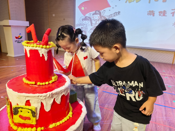 活动的最后,是最有仪式感的“送礼物”环节!每个班选出一位小代表,迈着稳稳的小脚步,把小红旗轻轻插在“生日蛋糕”上。看着满是小红旗的“蛋糕”,所有小朋友一起大声喊:“祖国妈妈生日快乐!”——那一刻,小红旗映着小笑脸,热爱与童真撞了个满怀。