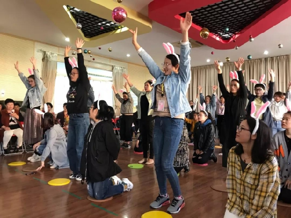 活动由热身游戏《你是我的眼》拉开了序幕。家长分别作为引导者与被引导者,跟随优美的音乐随之舞动,也让家长们感受到了平时作为“被引导者”的孩子们的内心世界。活动中,主持人喇春燕老师指出:“绘本舞蹈”是绘本阅读的一种传承,更多的是启发、引领孩子,而不是制约、限制孩子。遵循这样的大方向,每位家长都可以找到适合孩子和自己的阅读模式。燕子老师以绘本《猜猜我有多爱你》为例,与家长一同感受故事,表现故事,感受大兔子与小兔子之间“爱”的传递。家长们童心未泯,沉浸于兔子的角色扮演,随着绘本中大兔子小兔子表达爱的不同方式,用自己的舞姿表达感受,真正地体会到“舞蹈源于内心”这句话的涵义。
