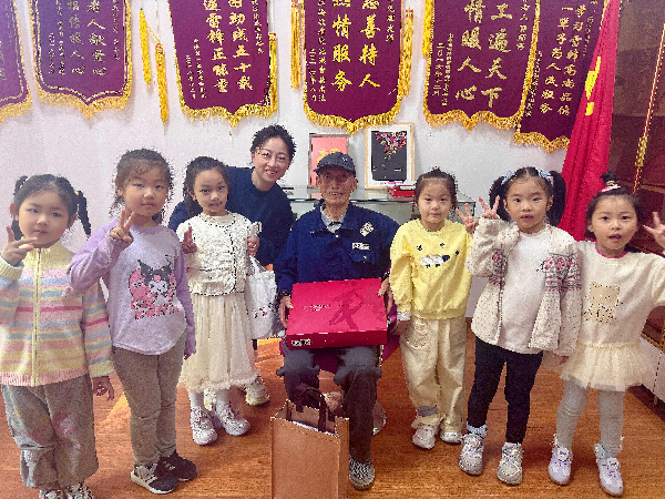 退休教师郭裕先爷爷是一名始终践行初心的老党员。退休后,他未曾停下服务的脚步,多年来坚持无偿为邻里理发。传递着老党员为民服务的温情与担当。在郭裕先爷爷的指引下,大家参观了他的理发工作室,孩子们的注意力被墙上悬挂的一面面鲜红的锦旗所吸引。郭爷爷用质朴的语言,为孩子们讲述了这些荣誉背后艰苦奋斗、无私奉献的岁月故事。这一张张奖状、一面面锦旗都是大家对郭爷爷精湛手艺和热心服务的最好认可。一颗颗关于奉献、敬老与感恩的种子,悄然在稚嫩的心田里生根发芽。孩子们为郭爷爷表演了精心排练的重阳节歌谣和充满童真的舞蹈。还将自己亲手绘制的重阳节画作献给爷爷,并送上“爷爷重阳节快乐!”的真挚祝福。郭爷爷看着孩子们活泼可爱的模样,脸上洋溢着幸福慈祥的笑容,屋内瞬间被欢声笑语与浓浓温情所充盈。